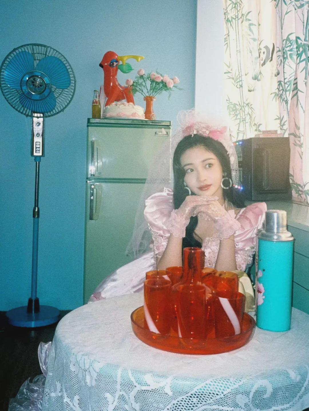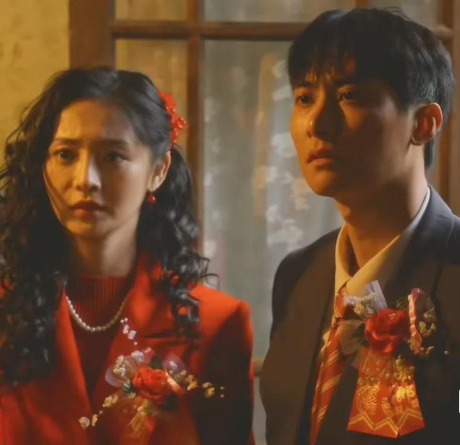 大红婚服也很有年代感,无论是大红的头饰,还是珍珠腰带配饰,以及后面旧旧的书柜,书柜上面的塑料花,都具有浓浓的年代感。