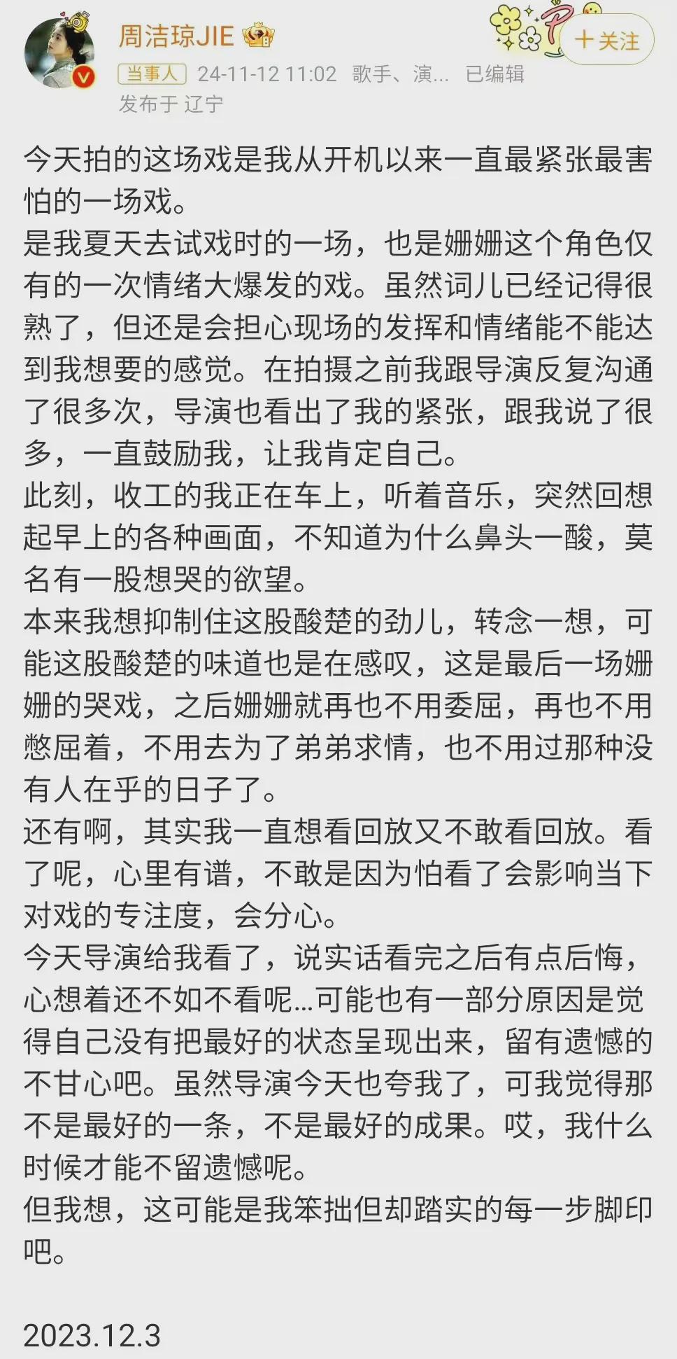 当天,周洁琼特意发了一篇长文,是她2023年在拍完这场戏之后,导演让她看回放时,她详细记录下来的自己拍这段戏前前后后的心路历程。
