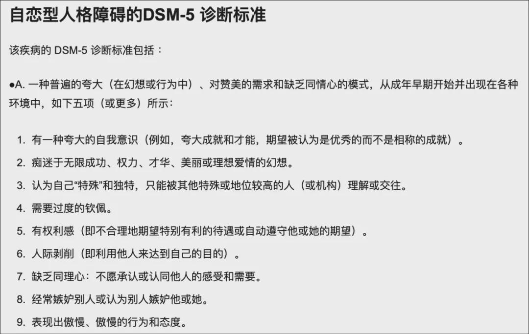 自恋型人格障碍的DSM-5 诊断标准