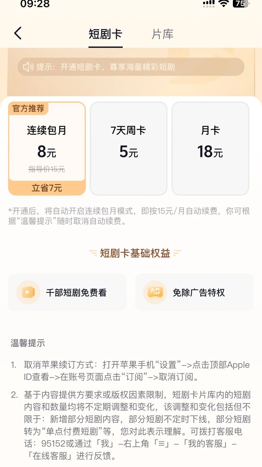 相较于少则个位数、多则近百元解锁一部短剧,5元的短剧周卡、8元的连续月卡对于短剧爱好者来说明显颇具性价比。