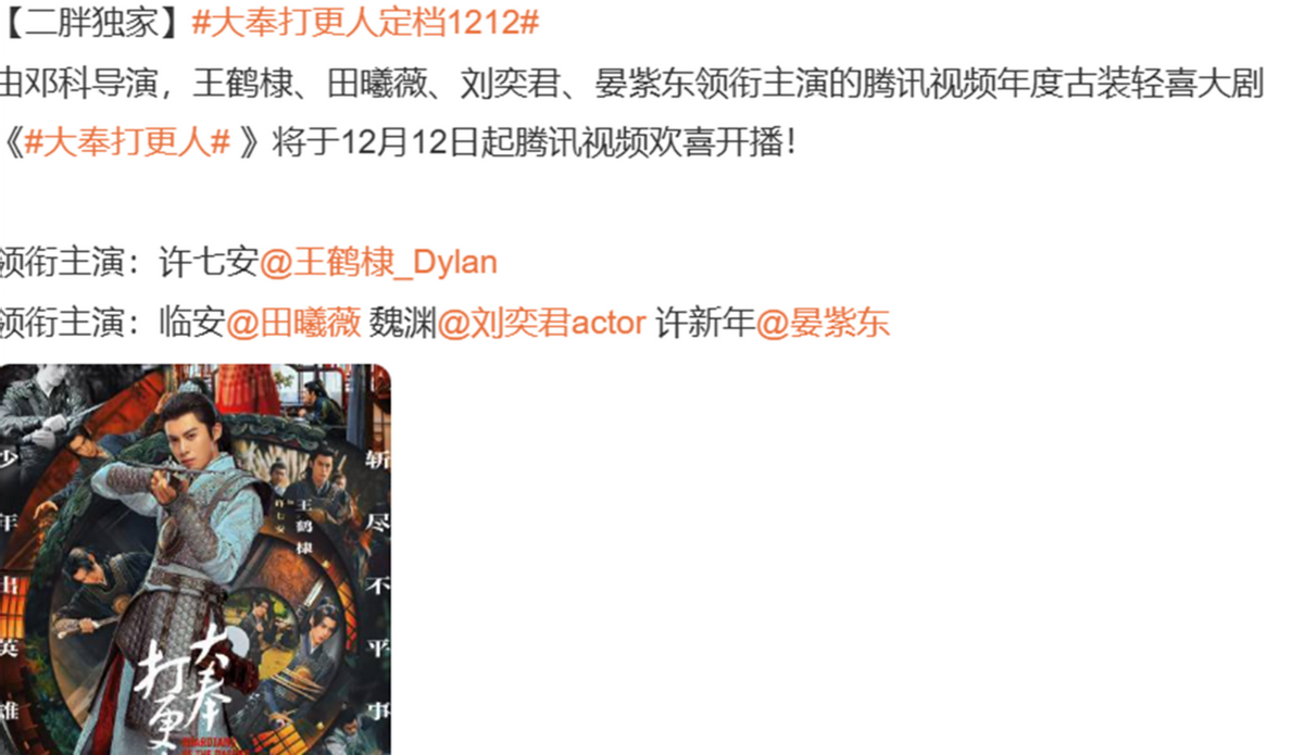 就在观众纷纷抱怨好久没有看到过一部让观众赞不绝口的探案喜剧之时,别急!终于要播了!又一新探案喜剧《大奉打更人》来袭,将于12月12日在腾讯视频播出,深受大众的关注,再加上还有两位顶流领衔,这下终于有好剧追了。