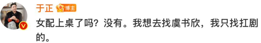 最近虞书欣和丁禹兮主演的剧热播中,同剧中饰演男二女二的演员也都收获热度,热度上来了自然有人会上杆子蹭一蹭,这不于正就来了嘛~他从自己评论区里挑了个评论 (评论内容是让于正赶紧找祝绪丹,说她火起来了,问有没有女主角色给她) ,他阴阳怪气回复说祝绪丹没上桌,他只想找虞书欣,说自己只找扛剧的。
