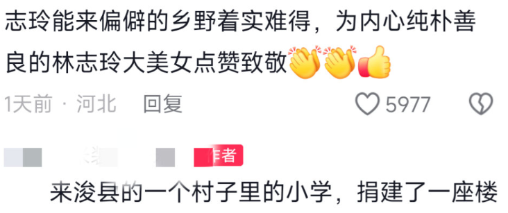 最近林志玲去到河南浚县一所小学,看望帮扶小学的孩子们,河南省文化和旅游厅官方微博发文提到了她,所以网上很快就出现热搜话题,话题里面还有林志玲看望帮扶小学孩子们的照片和视频。当地村民也主动发声夸林志玲人美心善,说她捐了60万还送了礼物。这个行为肯定是件好事,不过有网友就觉得这是女方在作秀炒作。
