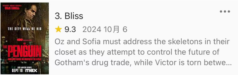 在imdb平台,《企鹅人》的第三集一出,评分直接飙上了9.3分,观众口碑极佳。
