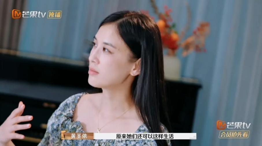 另一方面,离开了杨子的捆绑,观众看到了黄圣依更有深度的一面。以往爱炒作的浮躁喧嚣褪去,人们发现黄圣依其实内敛多于外放。她会一个人在床上阅读厚厚的《博弈论》;把精力重心放在家庭,围绕孩子的作息安排自己的生活;为了提升自我,花两年时间去参加赖声川话剧的演出;她能够共情他人的感受,会在麦琳情绪崩溃躲进卫生间时前去安慰;她对另一半的所有诉求就是“被看见、被尊重”,但就这一点,杨子也是选择“视而不见”,一直把“小孩儿”挂在嘴边。眼角的眼泪,让观众听到了黄圣依在平静而麻木的表象之下,自尊破碎的声音。
