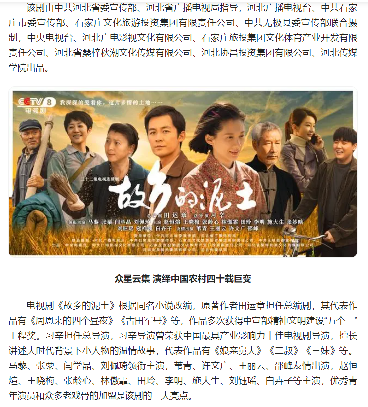 参考资料:大众网:《敢于“三突破” “泥土”自芬芳 ——电视剧《故乡的泥土》创作感受》2024-11-14环京津新闻网:《电视剧《故乡的泥土》定档央视 演绎中国农村四十载巨变》2024-11-14