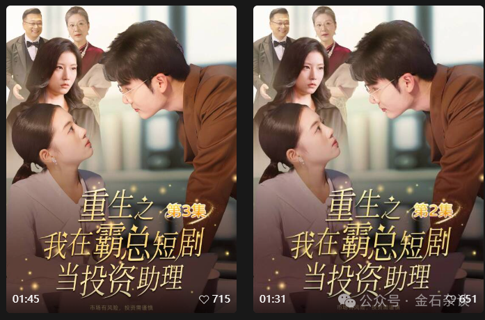 好了,说了这两部短剧,咱们转入正题。随着短剧市场爆发式增长,部分公募公司也杀入短剧赛道,东方红资管直接拍了一部《重生之我在霸总短剧当投资助理》,目前已拍了四集。具体内容如下: