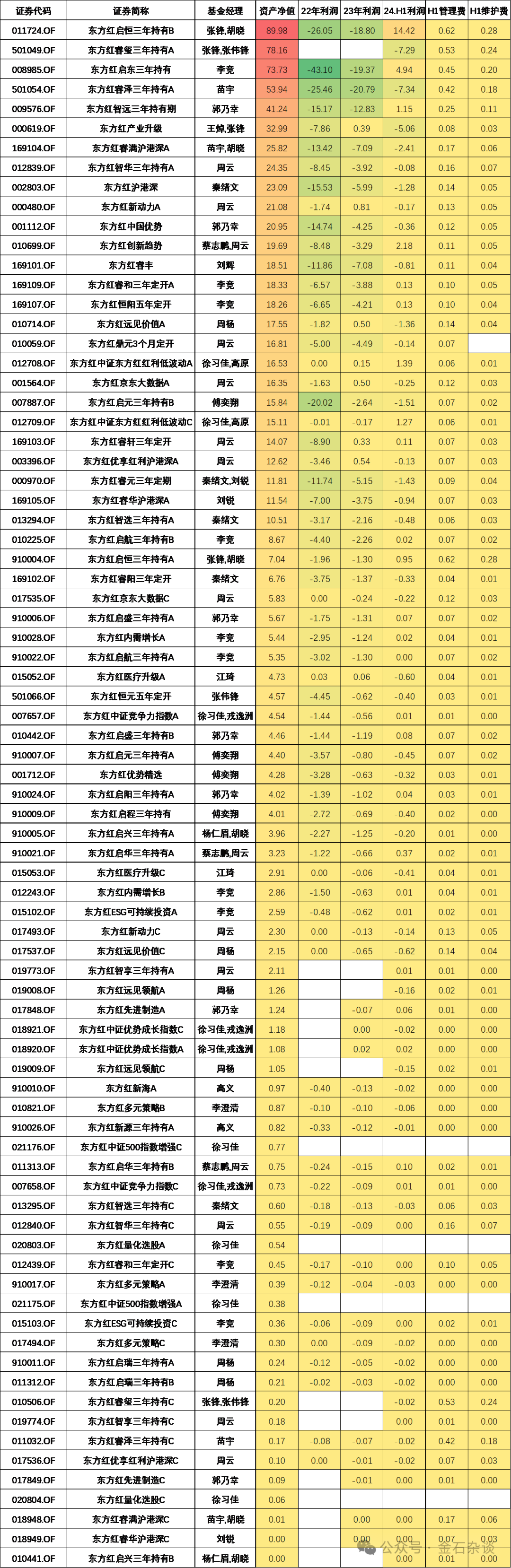 统计wind数据发现,东方红资管三年期产品22年和23年几乎全部大幅亏损,启东三年22年一年亏损43亿,启恒三年一年亏损26亿;23年东方红睿泽一年亏损超20亿。毫无疑问,基本在这三年亏惨了。