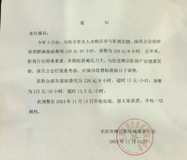 据红星新闻报道,有网传图片显示,原群众演员基础费用为120元/8小时,超时15元/小时;调整为135元/10小时,超时13.5元/小时,调整自2024年11月15日开始实施。