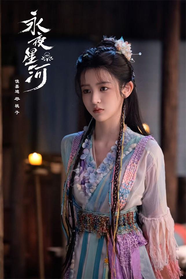 在《永夜星河》中,由饶嘉迪饰演的角色。饶嘉迪是北京电影学院的00后校花,桃子在剧中是一个单纯善良的无忧水寨少女。作为配角,她与虞书欣、丁禹兮等主演有精彩的对手戏,虽然桃子的戏份相较于主角不是特别多,但她的存在为剧情的发展增添了不少色彩和趣味。也是推动剧情的必要因素。