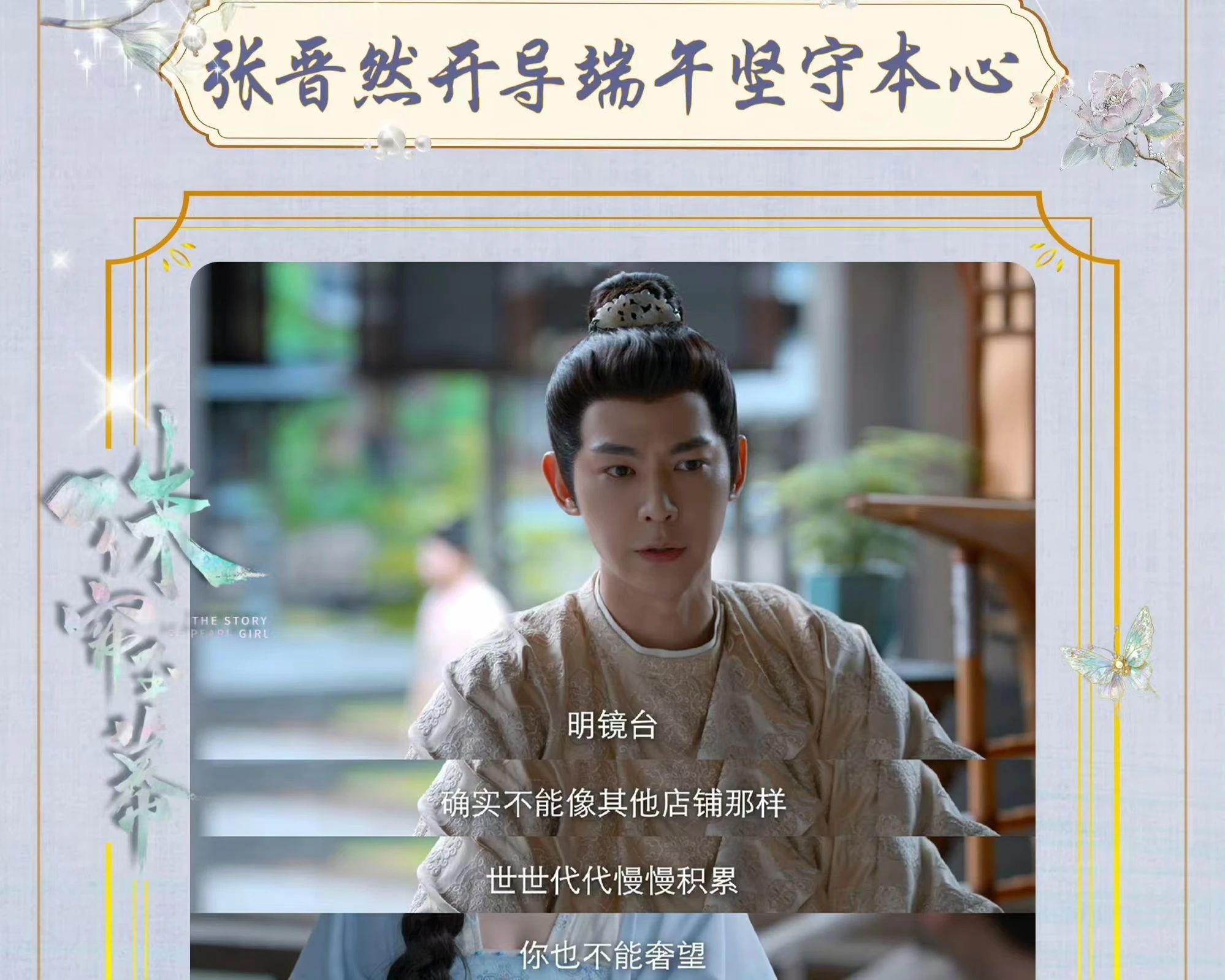燕子京死后,端午一直很消沉,明镜台的业务也一落千丈。关键时候,张晋然出手了,张晋然不顾家人强烈反对,辞去了官职,来到扬州照顾端午,帮着管理明镜台。