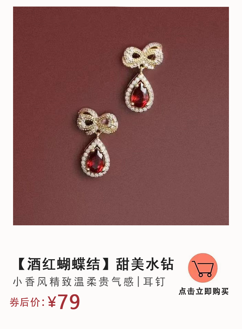 安可拉红色的皓石给耳钉增添了几分复古的风情,镶边的微钻则让水滴溢出更多光彩,特别提气色。