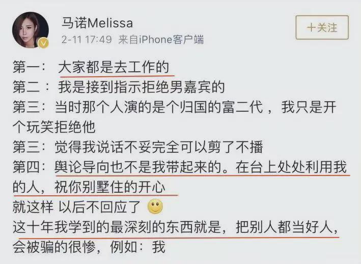 娱乐圈更新迭代很快,马诺很快就淹没在人群中,直到2019年,马诺又借故爆节目的料,她说自己拒绝男嘉宾,都是剧本,节目组还故意放大自己的玩笑话,引导别人炒作等等。