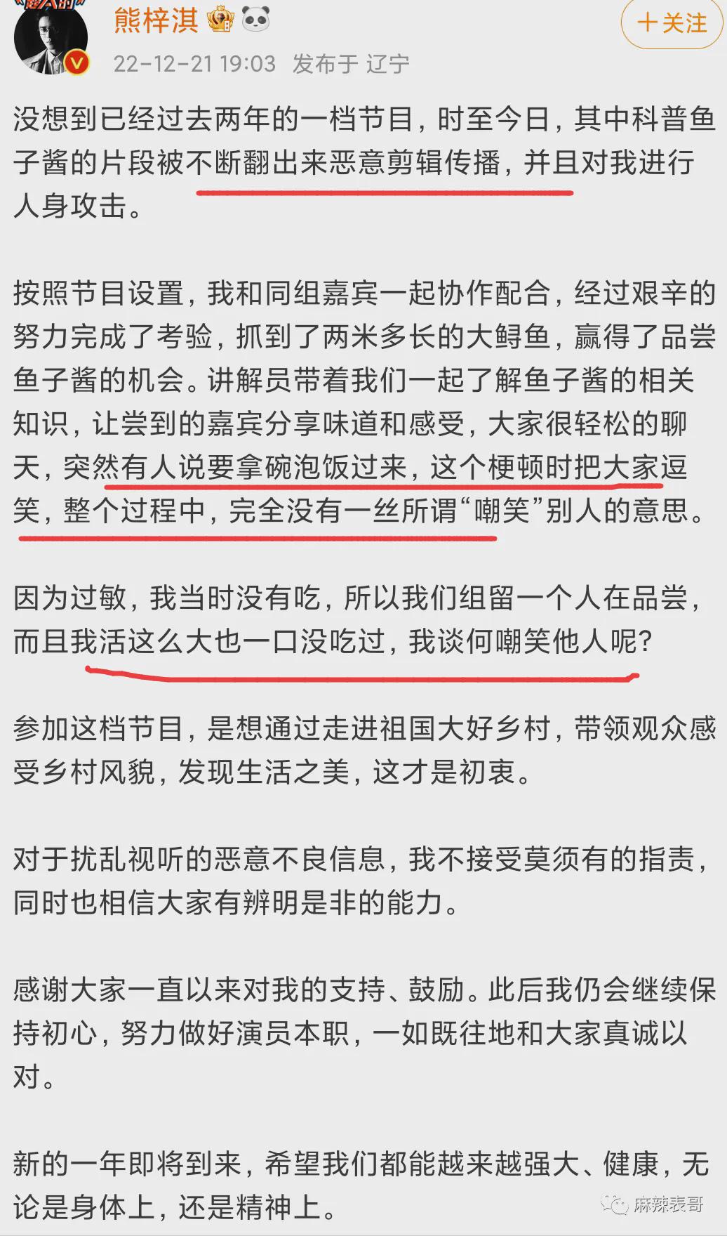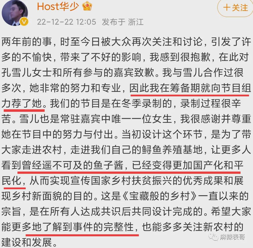 说孔雪儿是自己力荐来的,说节目的初衷就是让大家看到遥不可及的鱼子酱变得平民化,还说大家要了解到事件的完整性。
