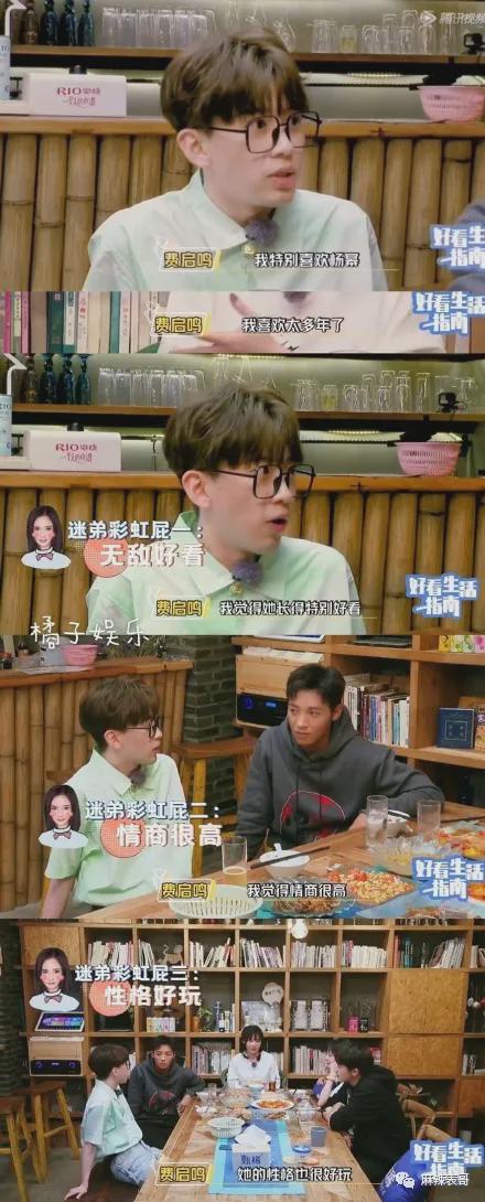 在节目上,费启鸣说自己的偶像是杨幂,从《仙剑》就开始喜欢,夸赞她漂亮、情商高、性格有趣。