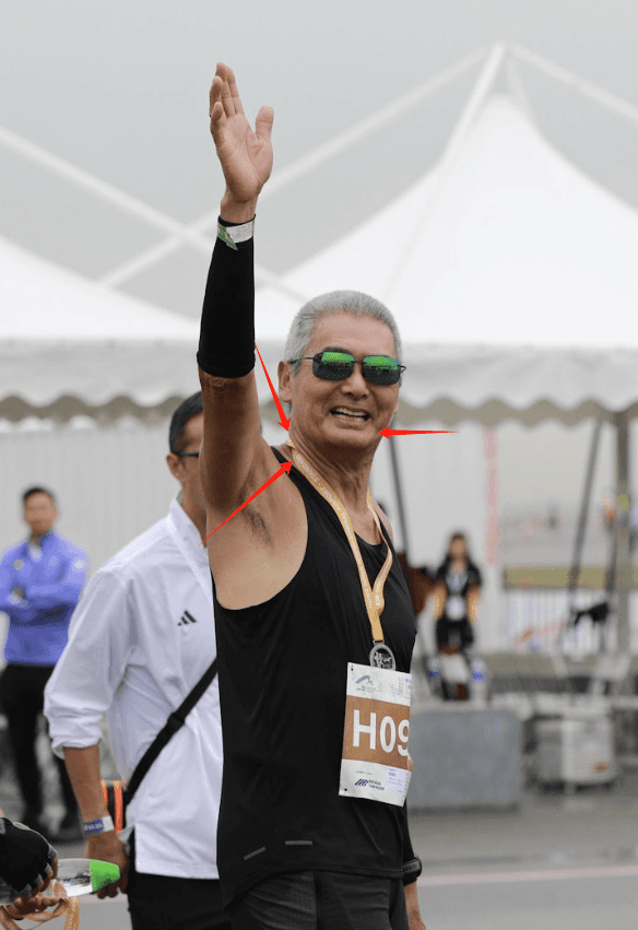 不得不说,虽然这套打扮方便跑步,但是暴露了太多他衰老的状况了。在照片中能注意到,周润发的身体和胳膊上,有两条明显的黑白分界线,而他的脖子有更加明显的老态。