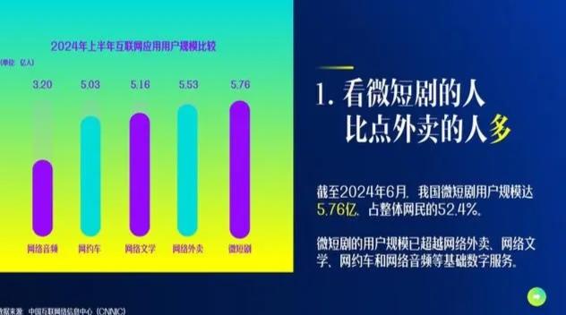 近日,中国网络视听协会发布的《中国微短剧行业发展白皮书(2024)》显示,2024年微短剧市场规模有望首次超过内地电影票房。而且,我国微短剧用户规模达5.76亿,已超越网上外卖、网络文学和网约车和网络音频等多类基础数字服务,成为数字生活的重要组成部分。