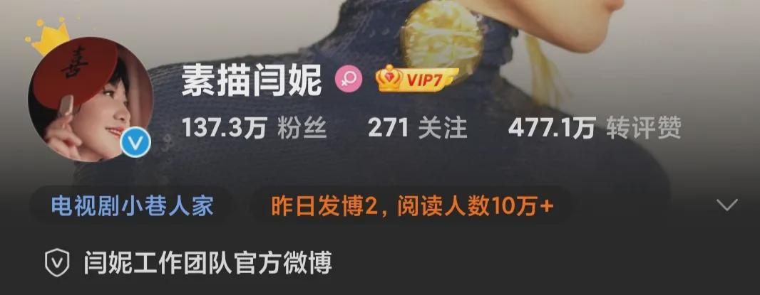 《小巷人家》主咖之一的闫妮,微博粉丝才130多万。