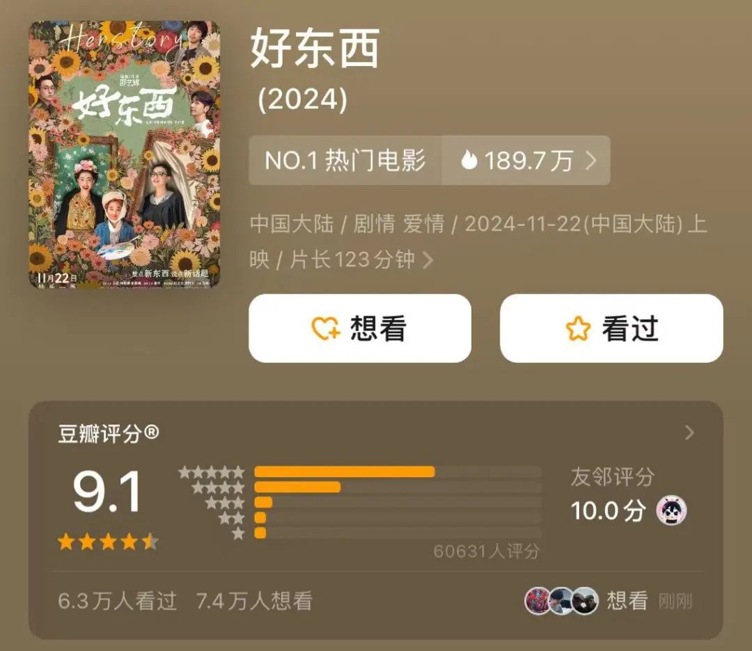 电影《好东西》自开启点映以来就好评如潮,6万人观影后打出评分高达9.1分。