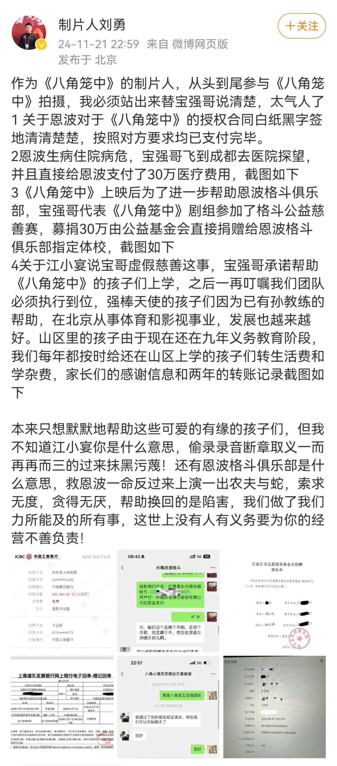 21日深夜,《八角笼中》制片人刘勇发声:“作为《八角笼中》的制片人,从头到尾参与《八角笼中》拍摄,我必须站出来替宝强哥说清楚,太气人了”。