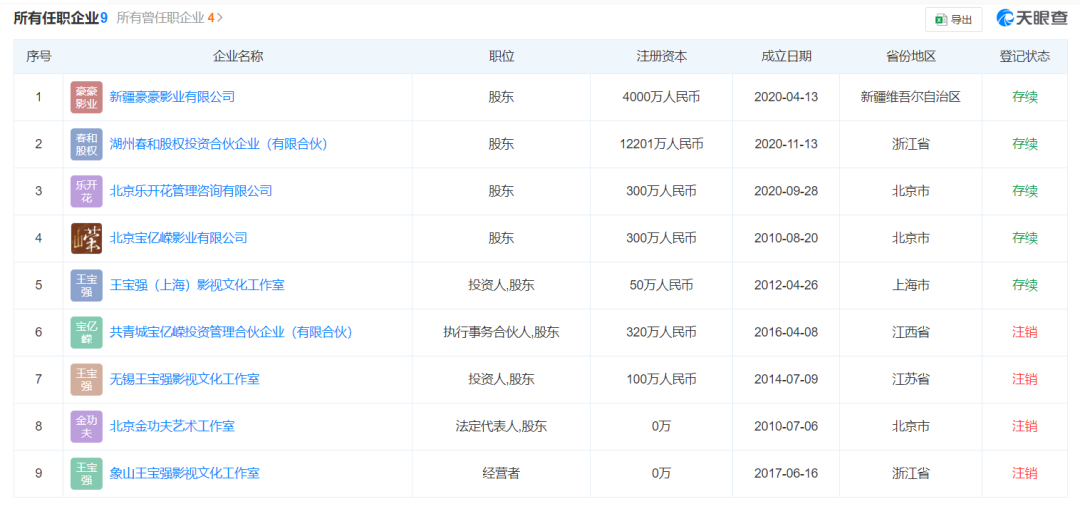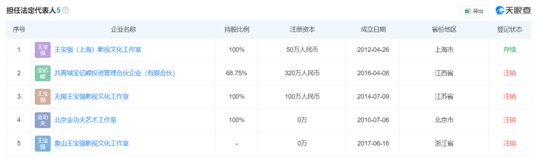 据21世纪经济报道援引天眼查App消息,王宝强名下共关联9家企业,其中5家为存续状态,包括王宝强(上海)影视文化工作室、北京宝亿嵘影业有限公司、北京乐开花管理咨询有限公司等,王宝强均担任股东,其商业版图包括影视、股权投资。