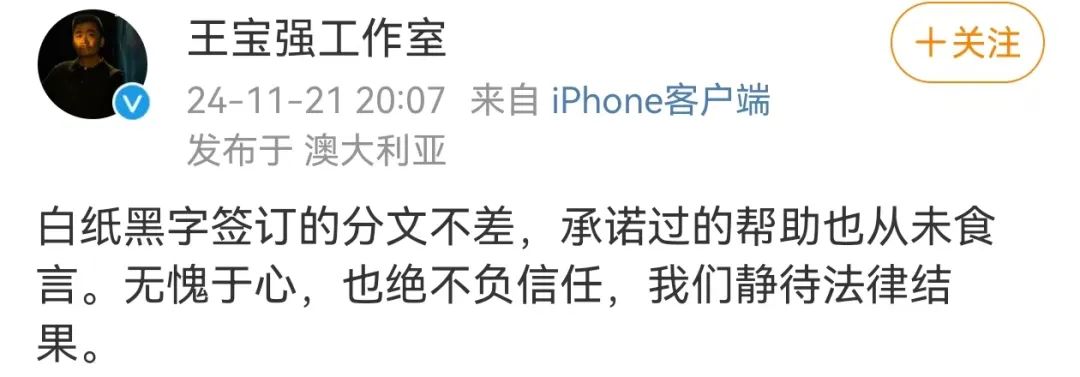 11月21日晚间,@王宝强工作室 发布一则博文称:“白纸黑字签订的分文不差,承诺过的帮助也从未食言。无愧于心,也绝不负信任,我们静待法律结果。”
