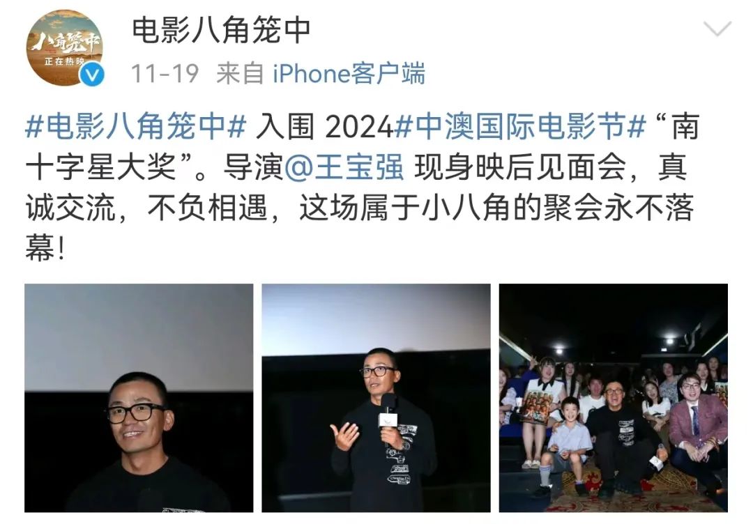 公开资料显示,《八角笼中》是王宝强自导自演的第二部电影,该片总票房突破21亿元,累计观影人次超过5156万。11月19日,据《八角笼中》官方账号,该片入围2024中澳国际电影节“南十字星大奖”。
