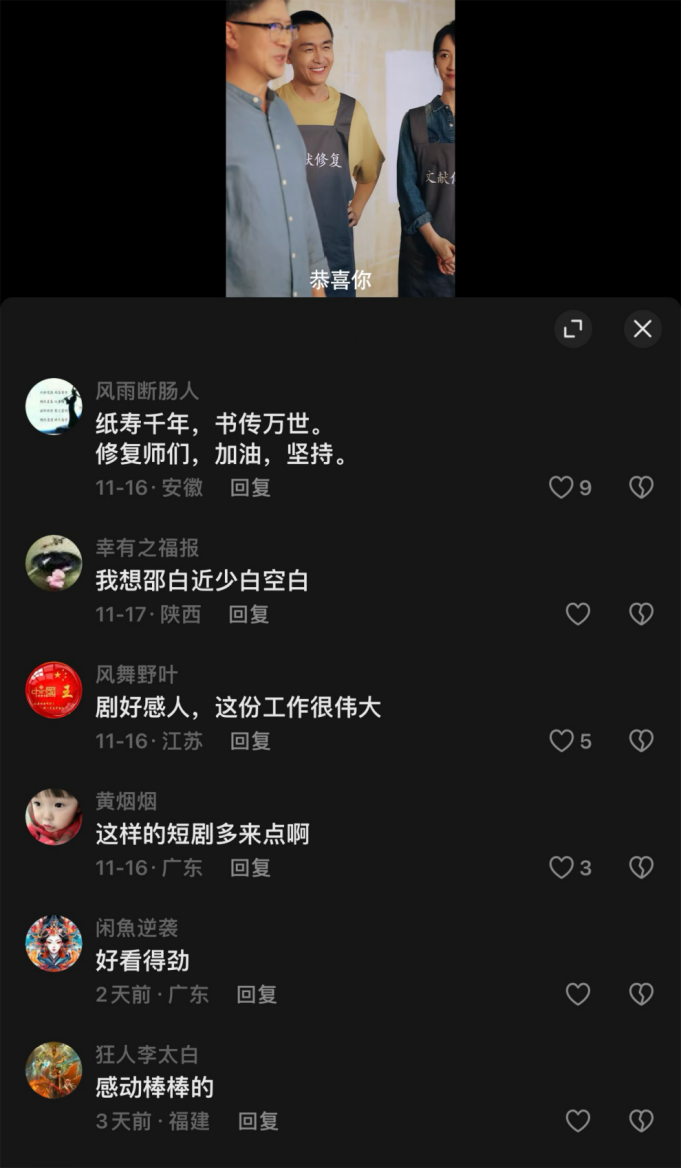 从古籍修复、文物保护到文化传承,这些短剧作品如同社会文化价值的扩音器,将原本相对小众、专业的文化议题以生动有趣、通俗易懂的形式传播到各个角落,激发了大众对社会文化议题的关注与参与,成为「文化价值具象化」的有力见证,从而进一步引导短剧市场的格局走向——