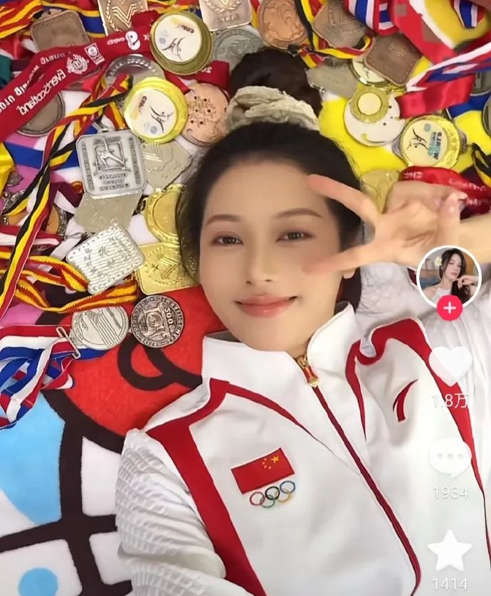 主页置顶的第一个视频,是她穿着国家队的衣服,躺在金光闪闪的奖牌里。