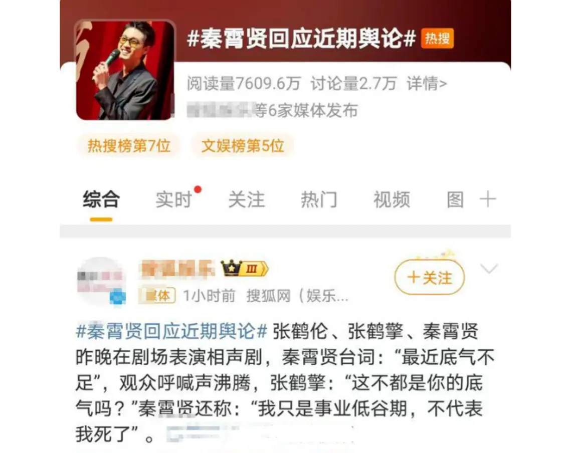 原来他在23日晚的天津德云社纲丝节上,公开回应了近期的舆论。当时他正在跟张鹤伦、张鹤擎表演相声剧,秦霄贤说道自己“最近底气不足”,紧接着台下观众开始欢呼捧场,张鹤擎指着台下的粉丝说,“这不都是你的底气吗?”