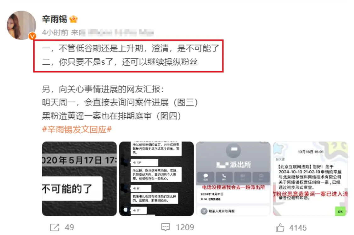 而辛雨锡在看到秦霄贤的喊话后也做出了回应,只见她晒出了相关聊天截图和案情进展通知,并配文称,“不管你是低谷期还是上升期,澄清,是不可能了”“你只要不是死了,还可以继续操纵粉丝”“黑粉造黄谣一案也在排期庭审”。