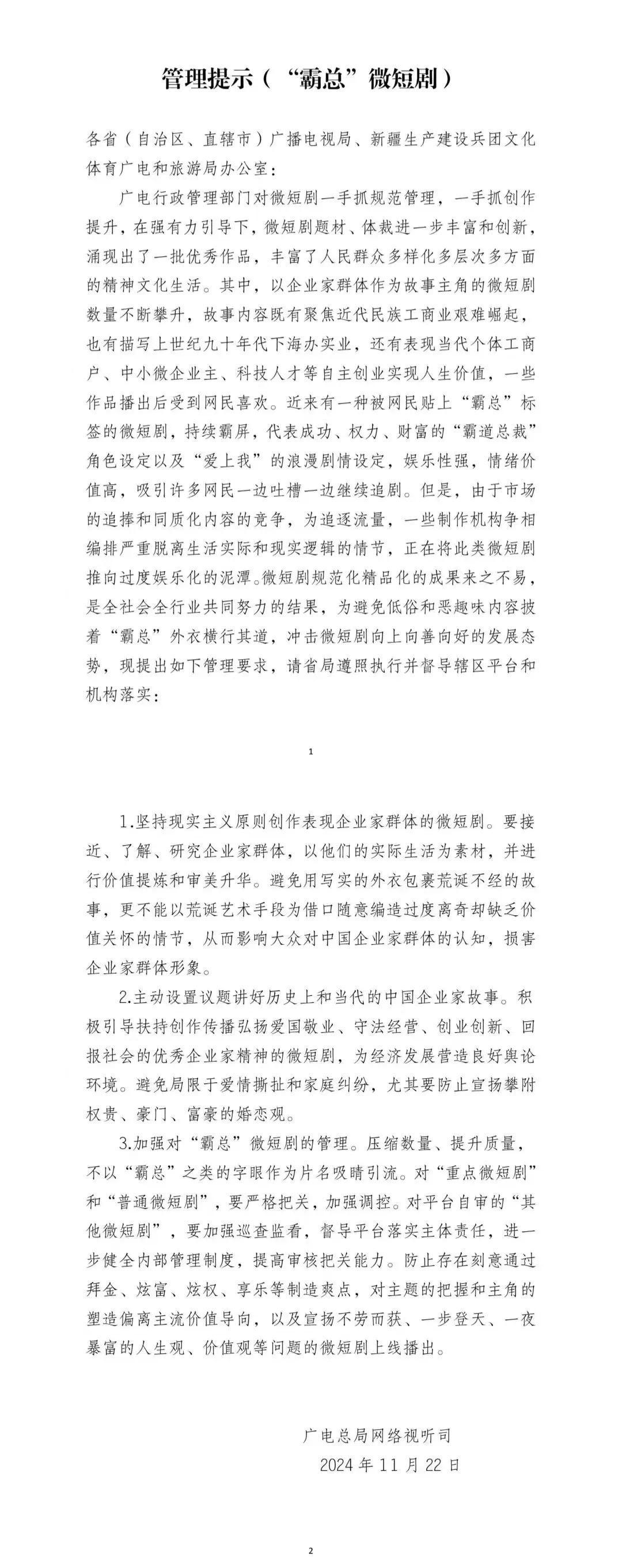 近日,广电总局发布霸总类微短剧管理提示,就霸总类微短剧的制作方向进行了指导。