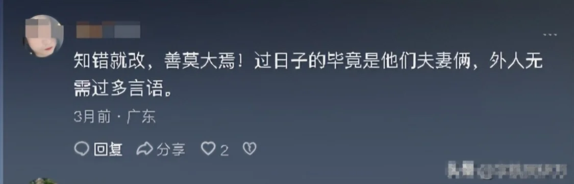 看到两人如此痴情,评论区的网友忍不住评论道:“知错就改,善莫大焉!过日子的毕竟是他们夫妻俩,外人无需过多言语。”