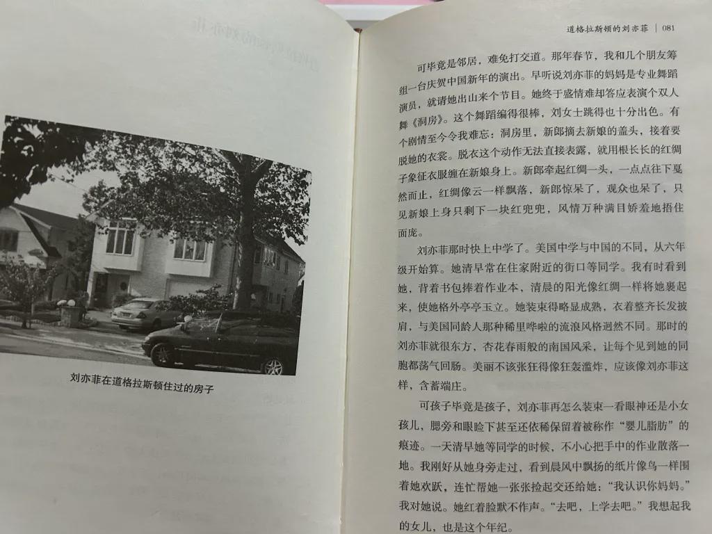 “我有时看到她,背着书包捧着作业本,清晨的阳光像红绸一样将她裹起来,使她格外亭亭玉立。她装束得略显成熟,衣着整齐长发披肩,与美国同龄人那种稀里哗啦地流浪风格迥然不同。”
