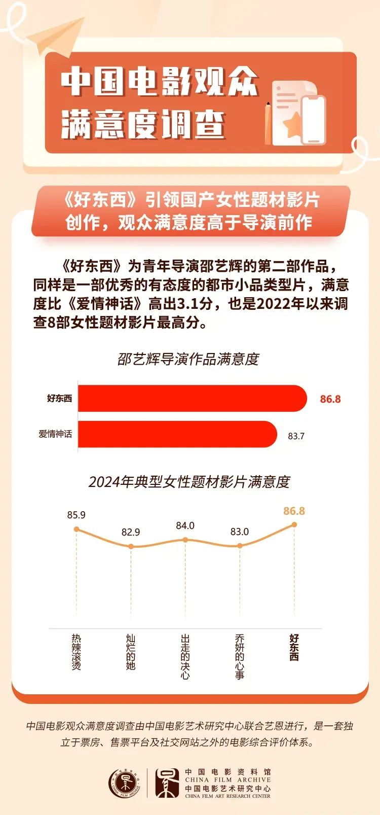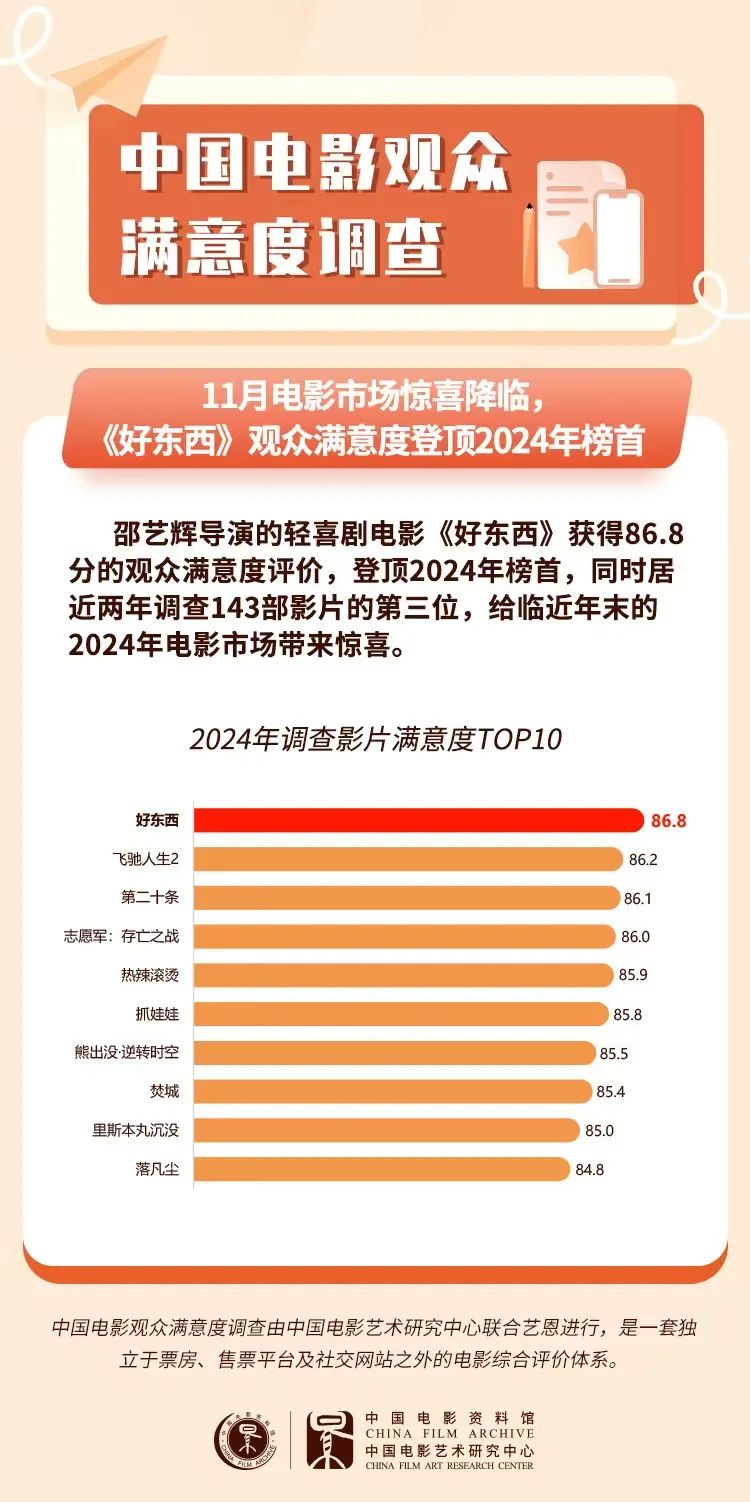 11月下半月青年导演纷纷携新作面市,电影市场亮点不断,《胜券在握》满意度84.5分,《好东西》满意度86.8分登顶2024年榜首。作为青年导演邵艺辉的第二部作品,《好东西》引领女性题材创作,影片新鲜、生猛又好笑,观赏性、新鲜度均为年内最高分。