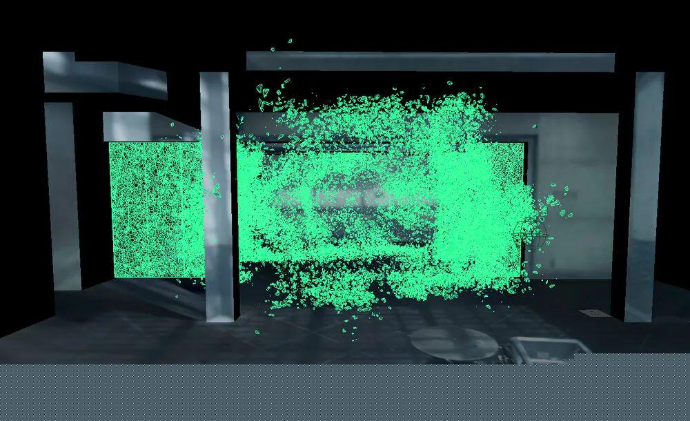 团队在CGSLAB的协助下对哈里森房间进行了高精度的3D扫描,基于扫描数据制作了飞散的玻璃和轻量化的背景模型,并投影了HDRI(高动态范围图像),以提高玻璃的反射精度。
