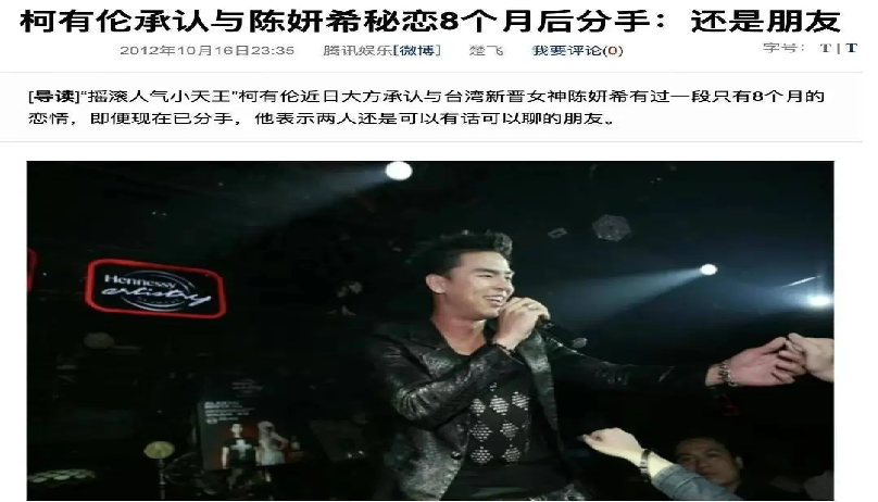 现在陈妍希没有红多久,就有台湾歌手柯有伦出来说:“自己曾与陈妍希秘恋8个月,虽然分手,但还是好朋友。”