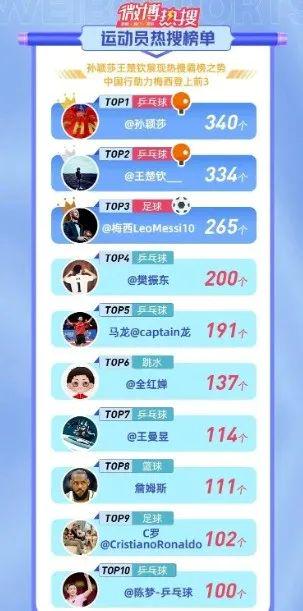 根据微博体育、微博热点发布的《2023年运动员微博报告》,热搜榜单前五有四位都是国乒运动员,排名依次为孙颖莎、王楚钦、樊振东、马龙。