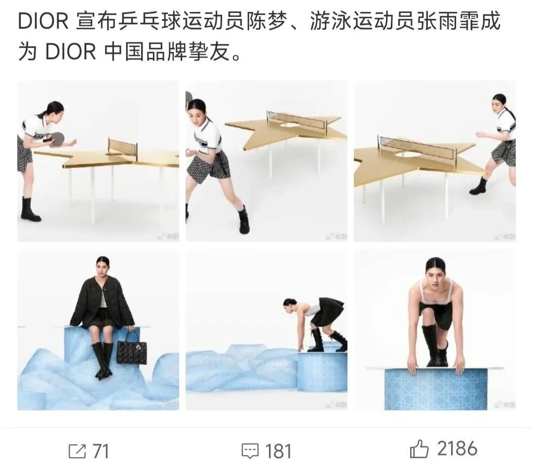 巴黎奥运前,迪奥、欧米茄、积家、泰格豪雅等都纷纷选择押宝运动员。迪奥打包宣了四个品牌挚友,分别为游泳运动员张雨霏、乒乓球运动员陈梦、击剑运动员孙一文、羽毛球运动员郑思维。
