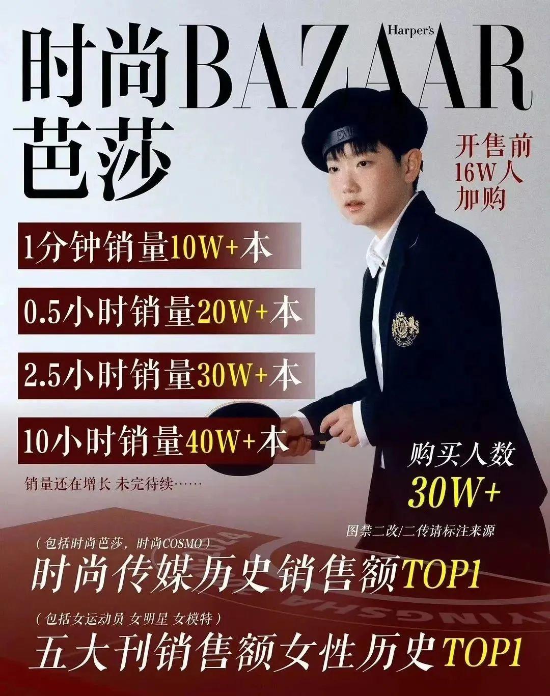 值得一提的是,《时尚芭莎》这一期在一分钟之内就突破10w 销量大关,这一成绩足以彰显她的高人气。甚至在内娱明星内,孙颖莎的销量也一骑绝尘、吊打了各位大小花。