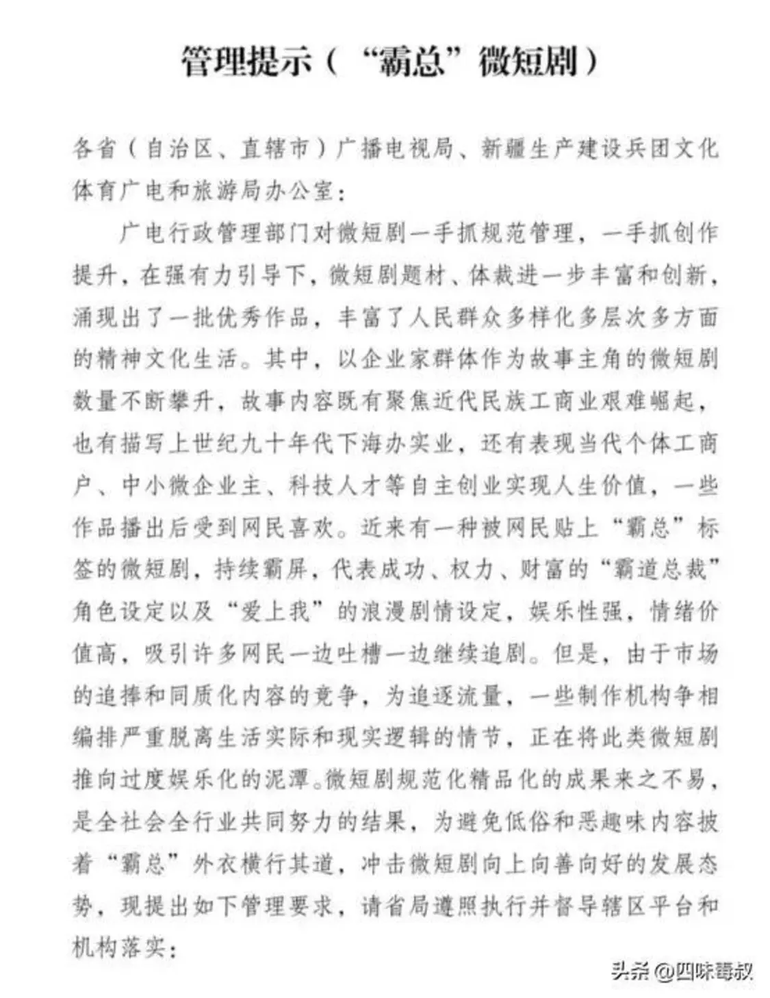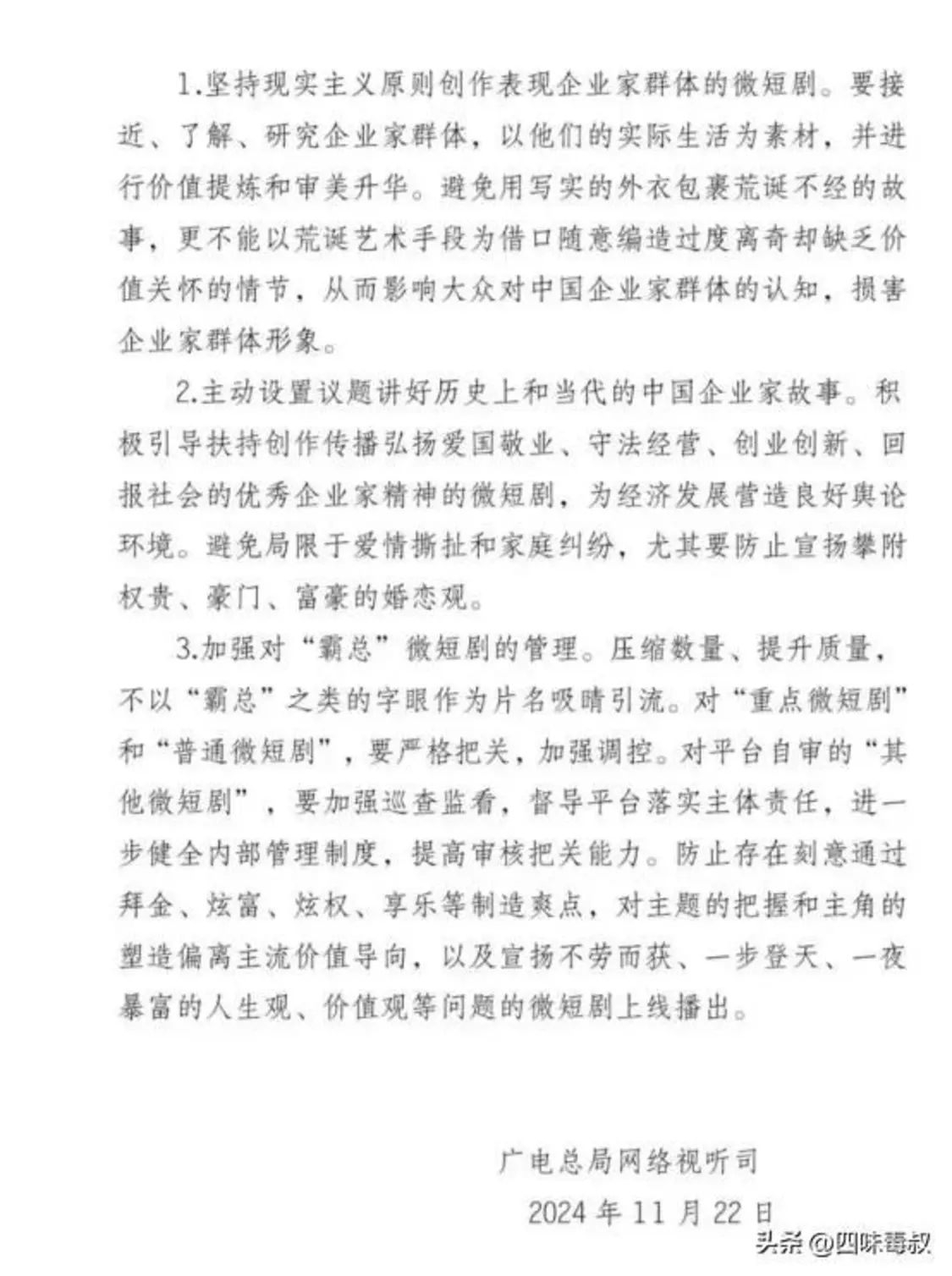 面对“霸总”短剧的泛滥和低俗化现象,广电总局在《管理提示》中提出了一系列针对措施,从创作原则、议题设置到内容管理,提供了清晰的方向。