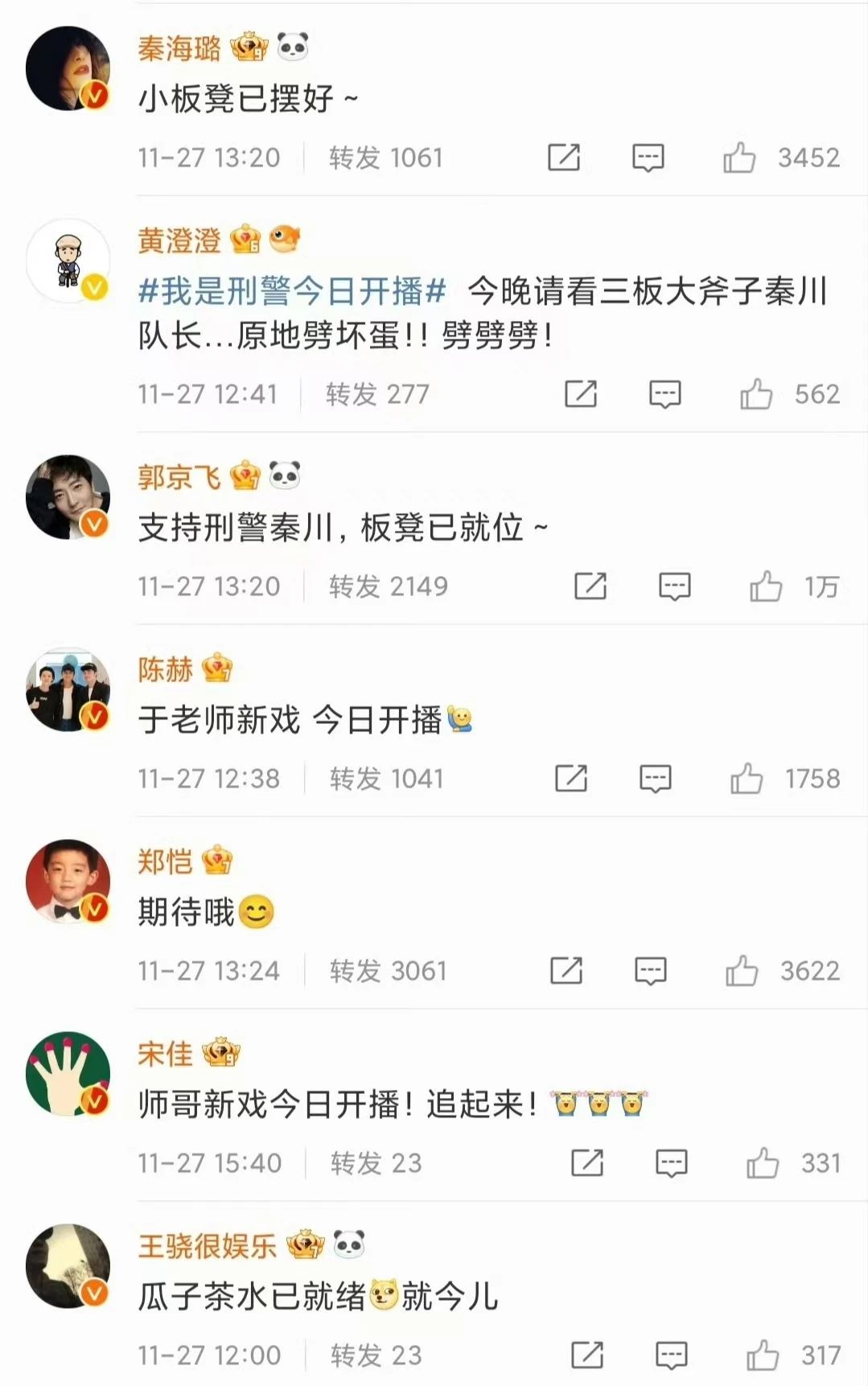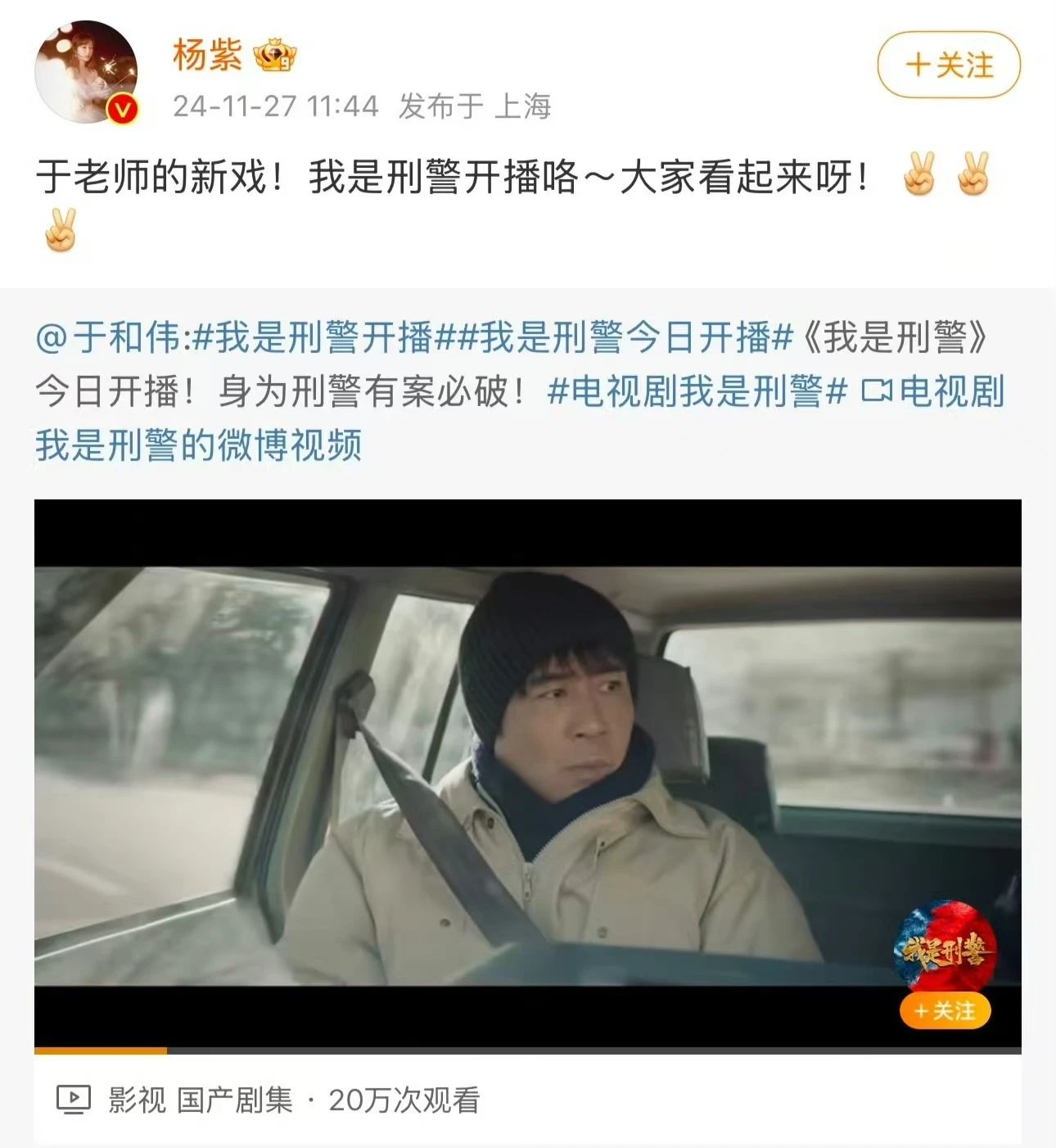 朱刚日尧:祝《我是刑警》开播大吉!支持和伟哥!