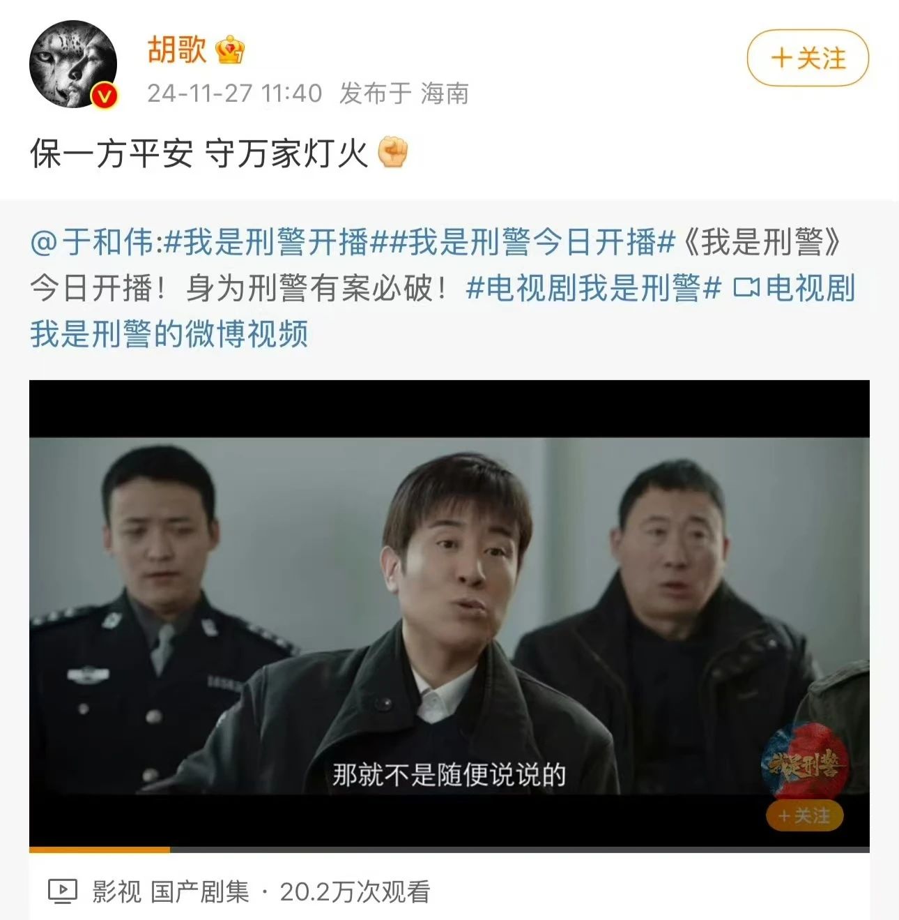 胡歌说到:保一方平安,守万家灯火。