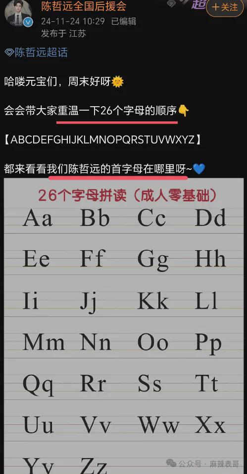 陈哲远后援会甩出一份字母表,炫耀陈哲远的名字在前面,把张婧仪粉丝气到掐人中。