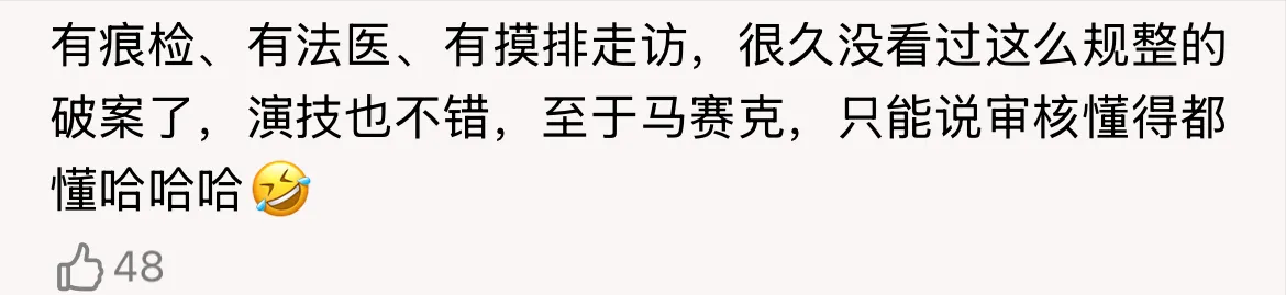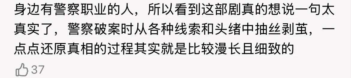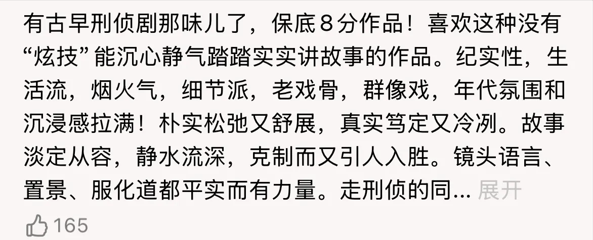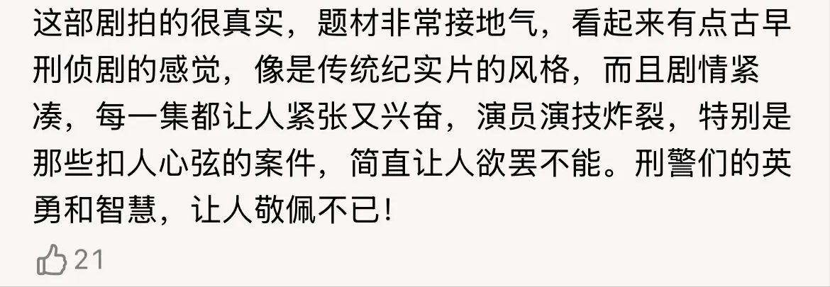 有古早刑侦剧的味道,没有“炫技”,没有虚头巴脑,没有突兀的感情线,编剧和导演都在沉心静气、踏踏实实得给观众讲故事,真真切切的回归本源的刑侦剧。