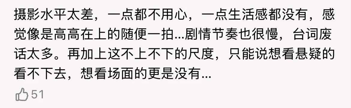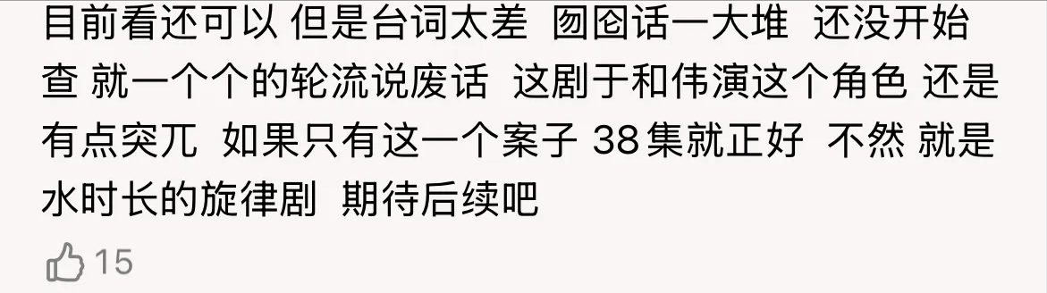 台词太差,太磨叽,囫囵话一大堆,还没开始查,就一个个的开始轮流说废话,警察讲线索能这么弯弯绕绕吗?