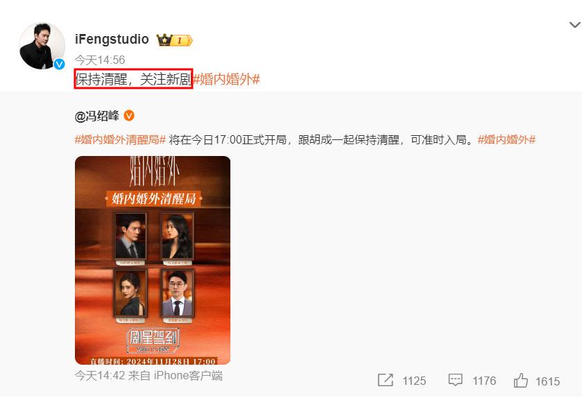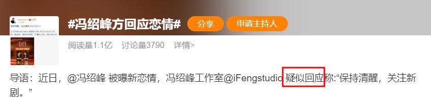 那么,这到底是不是真的呢?截至笔者发稿,冯绍峰本人并未正面回应此事,只是冯绍峰工作室转发了冯绍峰宣传新剧 《婚内婚外》的文案,并发布了一句“保持清醒,关注新剧”,疑似回应新恋情。