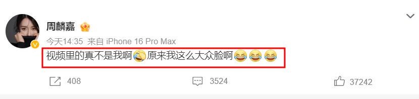 不过,在网友的热议中,周麟嘉出来辟谣了,她发文说视频中的女子不是她,她还感慨“原来我这么大众脸啊。”