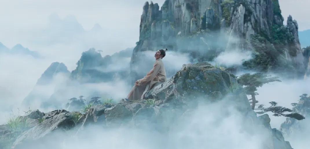 之后,攀至顶峰的希孟坐在山间眺望,水墨升腾成雾气又在下一秒化为散锋笔触,不难猜到,他又灵光乍现。