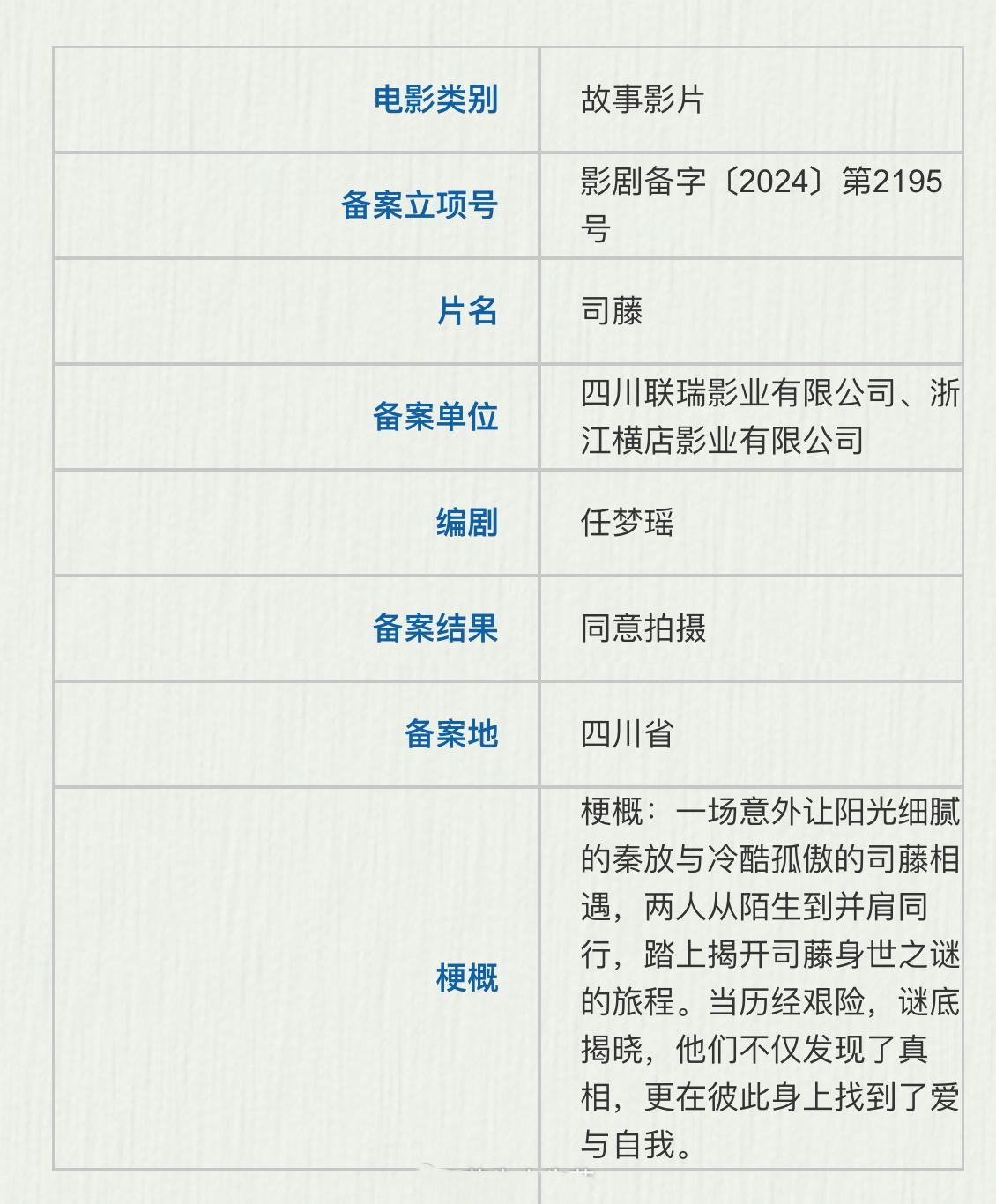 而在《司藤》火爆全网后,就有消息称影版《司藤》开始了筹备。但直到了近日影版《司藤》才拿到了相关备案,正式宣告启动!
